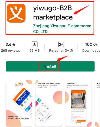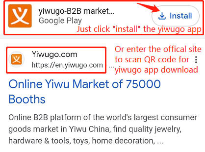 Type “yiwugo” in your browser: You will see the Yiwugo App install icon provided by Google Play. Simply click on it to download the app.
